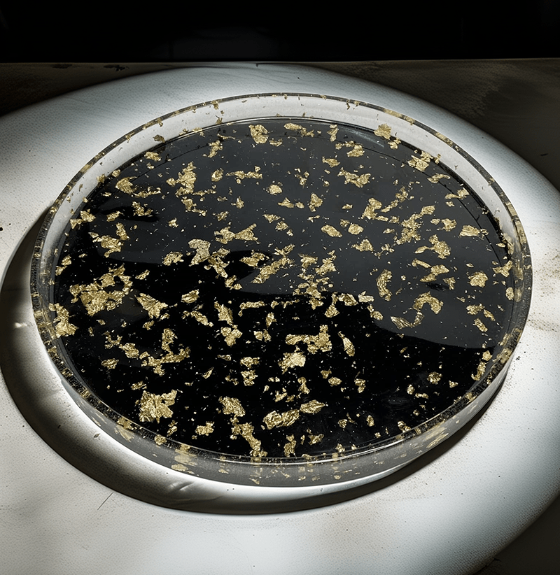 „Aurum Noctis“ – tai elegancijos ir funkcionalumo dermė. Šis iš aukštos kokybės epoksidinės dervos pagamintas rankų darbo padėklas spindi juodo nakties fono ir subtiliai įlieto aukso folijos kontrastu. Kiekvienas gaminys unikalus – kaip maža meno kūrinio dalelė jūsų namuose.