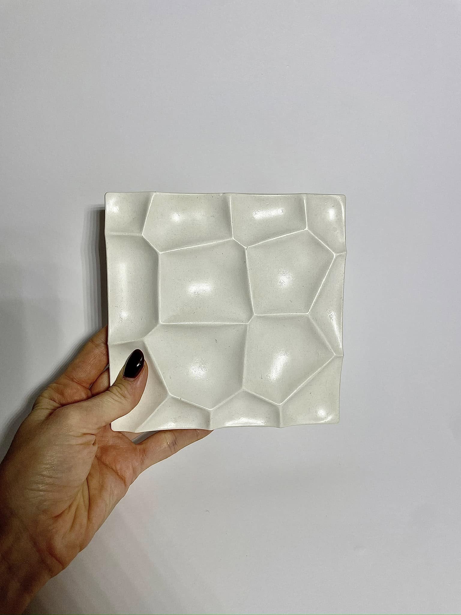 Minimalistinis, tačiau išraiškingas „Šviesos Ląstelės“ padėkliukas su geometriniu, organišką struktūrą primenančiu reljefu – puikus akcentas šiuolaikiniam interjerui. Pagamintas iš ekologiško jesmonito, jis yra lengvas, tvirtas ir visiškai unikalus – kiekvienas rankų darbo gaminys šiek tiek skiriasi savo paviršiumi ir atspalviu. Idealiai tinka puodeliui, smulkiems daiktams ar dekorui.
